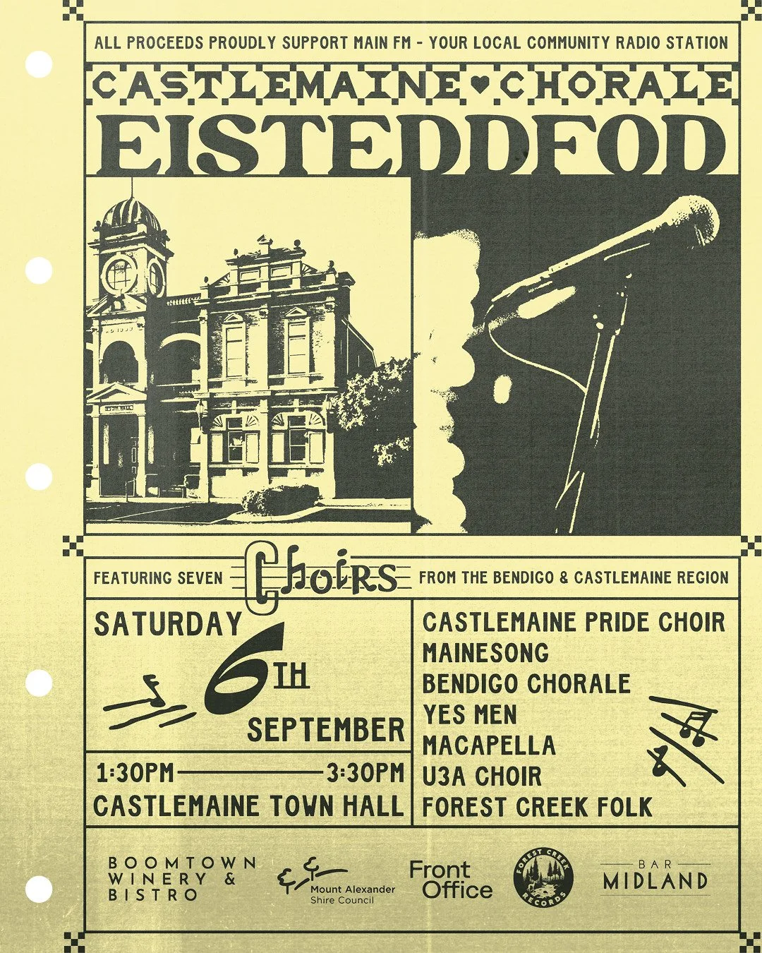The Castlemaine Chorale Eisteddfod was proudly sponsored by Boomtown Winery, Bar Midland, Front Office, and Forest Creek Records. This project was generously supported by the Mount Alexander Shire Events Grants Program.